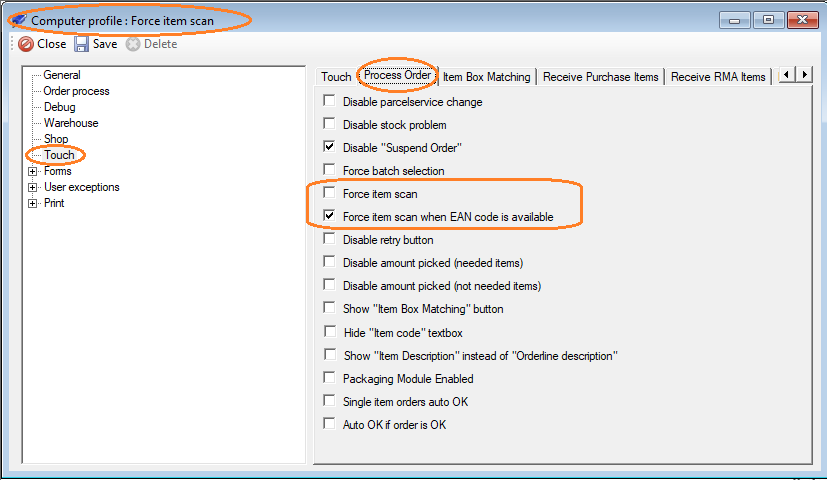 Maak een profile aan "Force item scan" en zet het vinkje op het tabblad Process Order voor de Touch