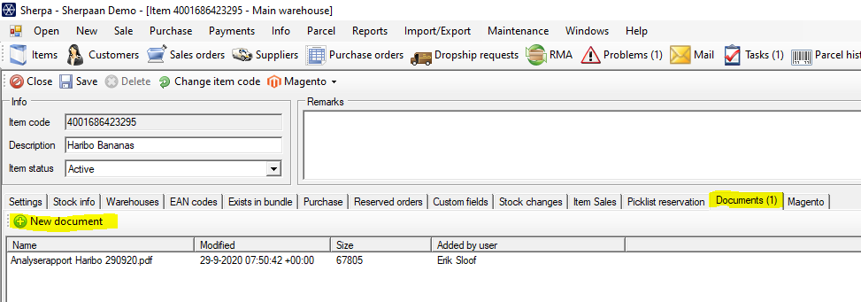 Als deze module is geactiveerd krijg je, na het toekennen van de juiste rechten, in Sherpa een extra tabblad “Documents” bij artikelinformatie, klanteninfo, salesorders, leveranciers en inkooporders.