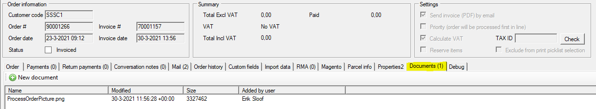 Nadat de order verwerkt is tref je de foto aan bij de order onder het tabblad "Documents"