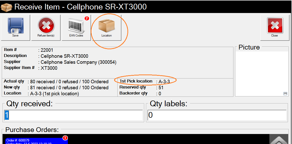 De Touch geeft default de 1st pick location als locatie om te ontvangen, ongeacht of er voorraad in het warehouse ligt. Deze locatie is te wijzigen door op Location te drukken.