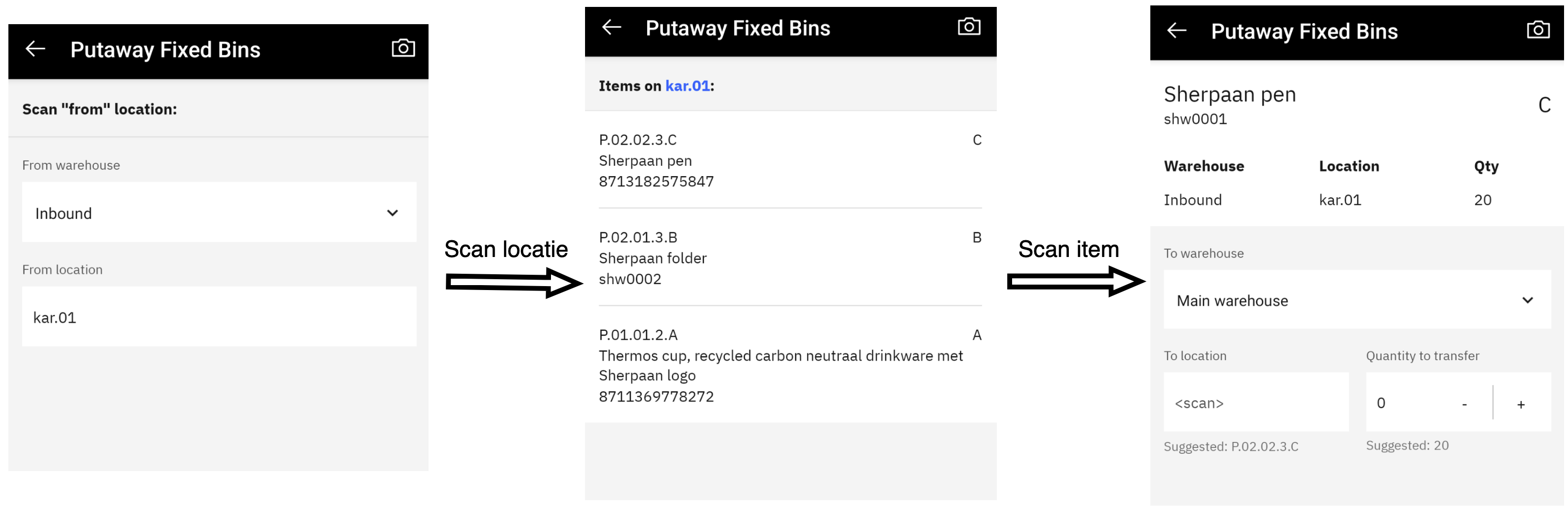 Dit kan in de app bij Inbound > Put away "Fixed bins" of "ABC". In beide gevallen scan je eerst een locatie in het Inboud warehouse en leg je de artikelen op die locatie weg in het Main warehouse. Bij fixed bins zijn de artikelen gesorteerd op de pick-locatie waar het artikel al ligt. En bij ABC krijg je bij elk artikel de ABC waarde te zien zodat je in het juiste gedeelte van het magazijn een lege locatie kan zoeken.