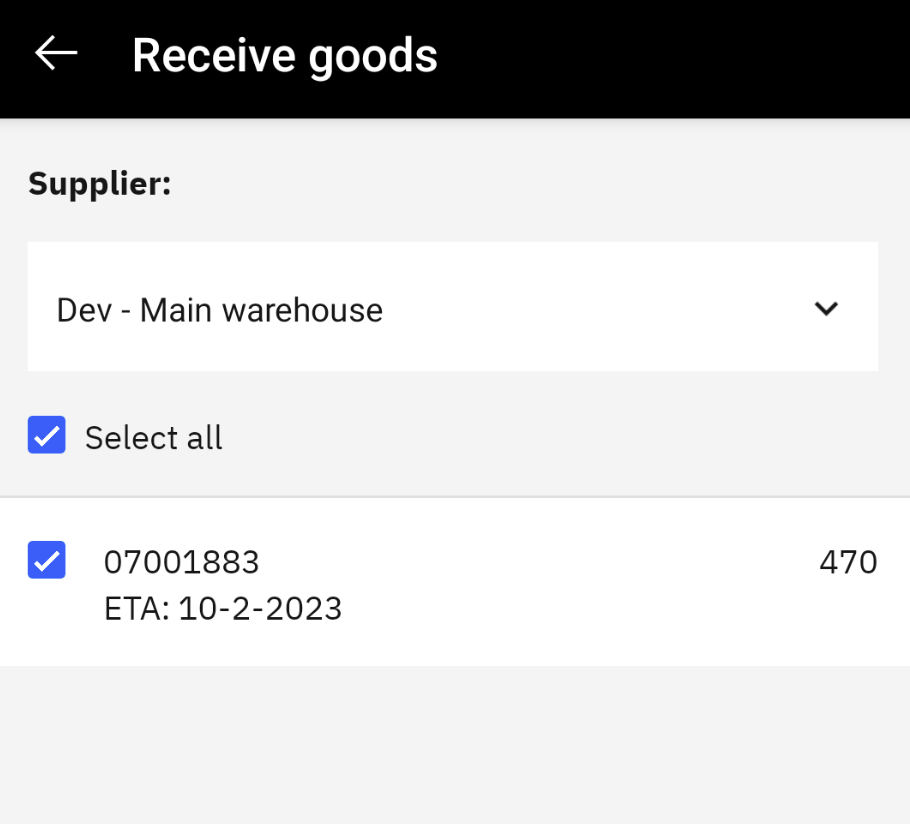 - Ga naar Inbound > Receive goods > Selecteer een leverancier en selecteer de bestellingen die je gaat ontvangen.