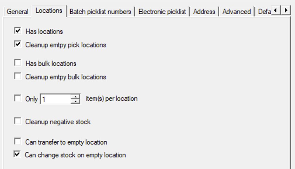 - In het inbound warehouse, zet "Has locations" en "Cleanup pick locations" aan.