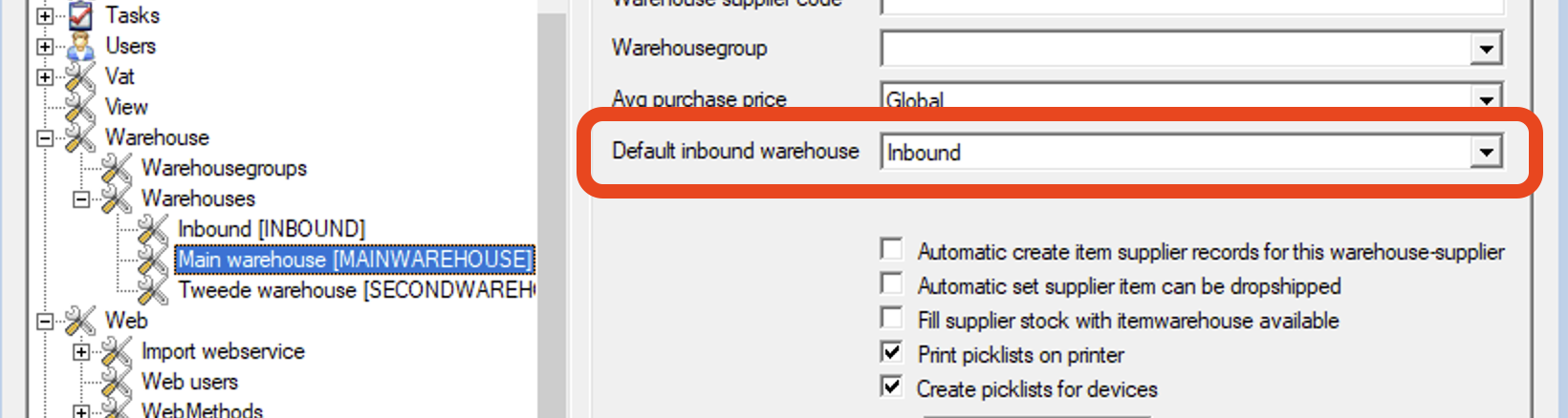 Inkoop bestellingen (purchases) hoeven niet besteld te worden in het Inbound warehouse. Dat kan nog steeds in Main warehouse, zodat het inkoop advies correct blijft.